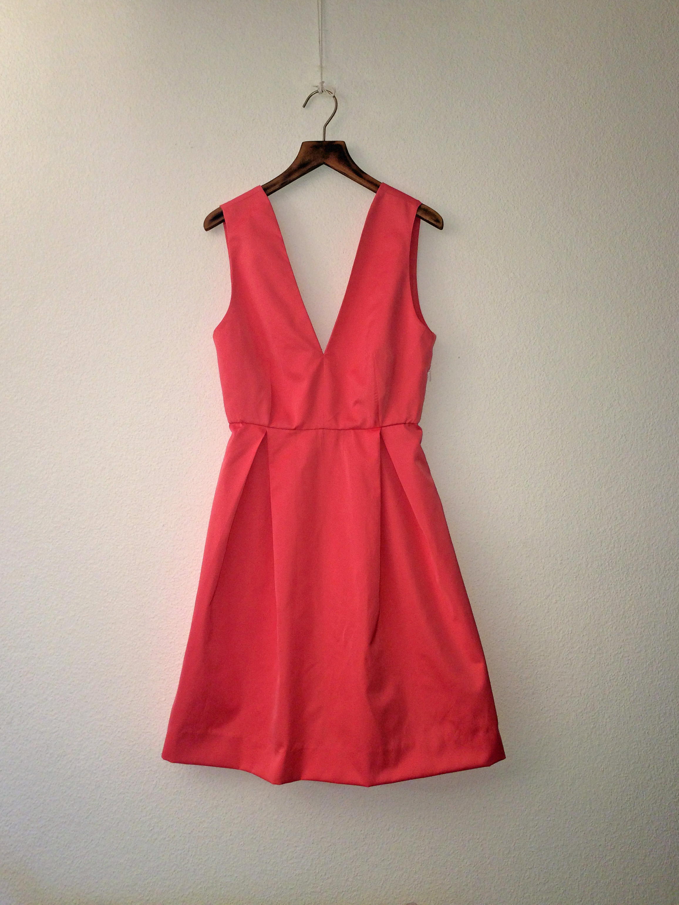 This salmon sundress has a V-neck front… and back and a skirt with box pleats. It is made with a slightly satin fabric that reflects light without being shiny. The fabric is made from 57% recycled polyester and 43% cotton.