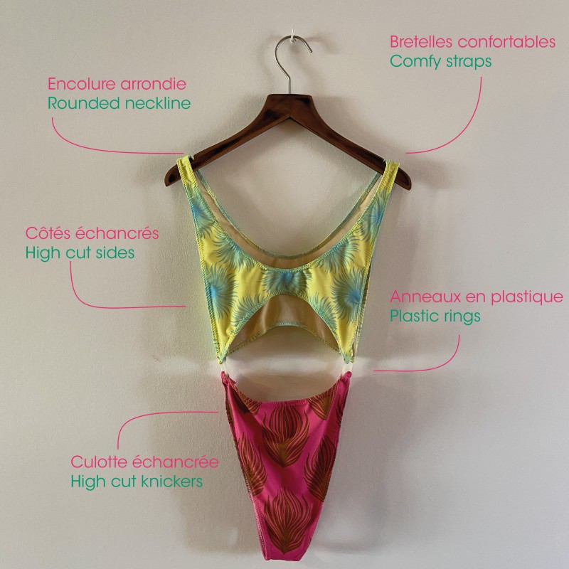 PISOC is a PDF sewing pattern of a one-piece swimsuit which includes a bralette and high-waisted, high cut knickers connected by a ring on the sides.